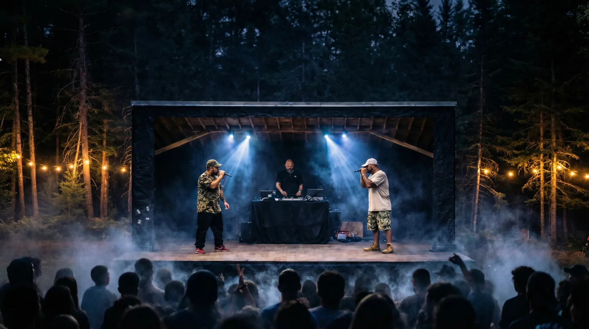 "Where City Bars Meet Country Ground." Backwoods Barz Battle brings rappers head-to-head under the lights in the woods. Expect heavy beats, live DJ sets, and high-energy performances as the first Champion earns a trophy and bragging rights at The Land.